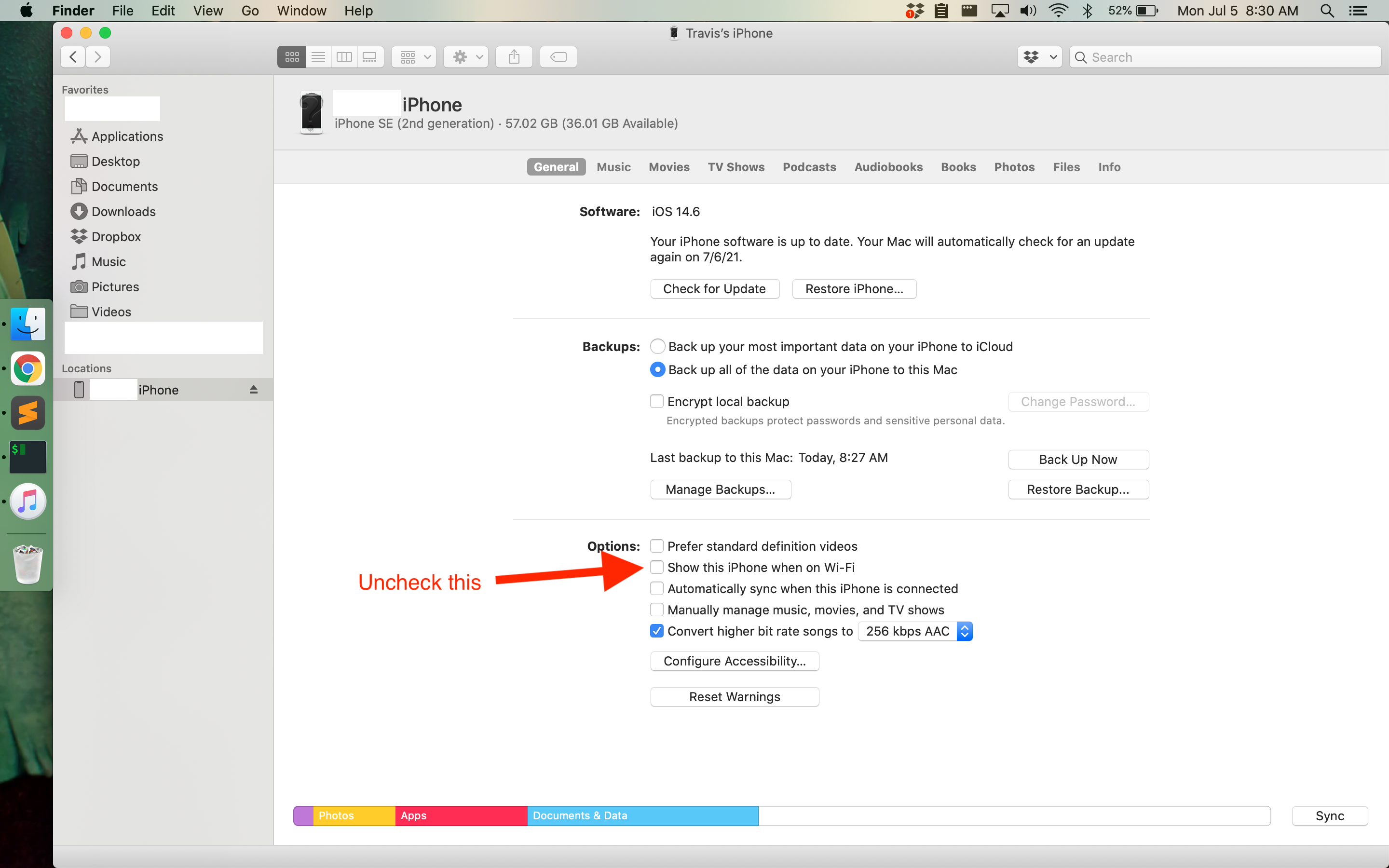 TL;DR: Turn off the "Show this iPhone when on Wi-Fi" setting in the iPhone settings using Finder in macOS.