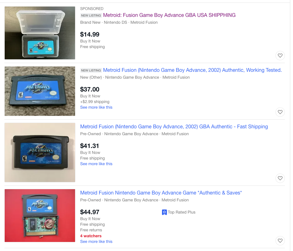 And I thought games would be $5 to $10 a pop without boxes and manuals, right? I was wrong again. But I didn’t find that out until after I had bought Metroid Fusion (eBay), for $9.99 plus shipping. That’s your first sign, for those keeping track of tips on how to spot a fake Gameboy game: