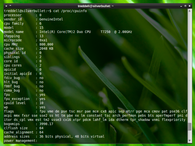 This will show you all kinds of stuff, like in the image above, for each core of your processor. To get a quick count of how many cores you have, you can use cat /proc/cpuinfo | grep processor.