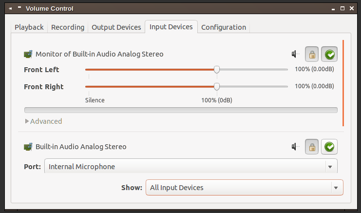 Next, launch pavucontrol and select the "Input Devices" tab. On this tab, select "All Input Devices" from the "Show" selection at the bottom. Then click the green check mark beside "Monitor of Built-in Audio Stereo". This has selected the internal audio as the source of your audio input so that any recording software will record it.